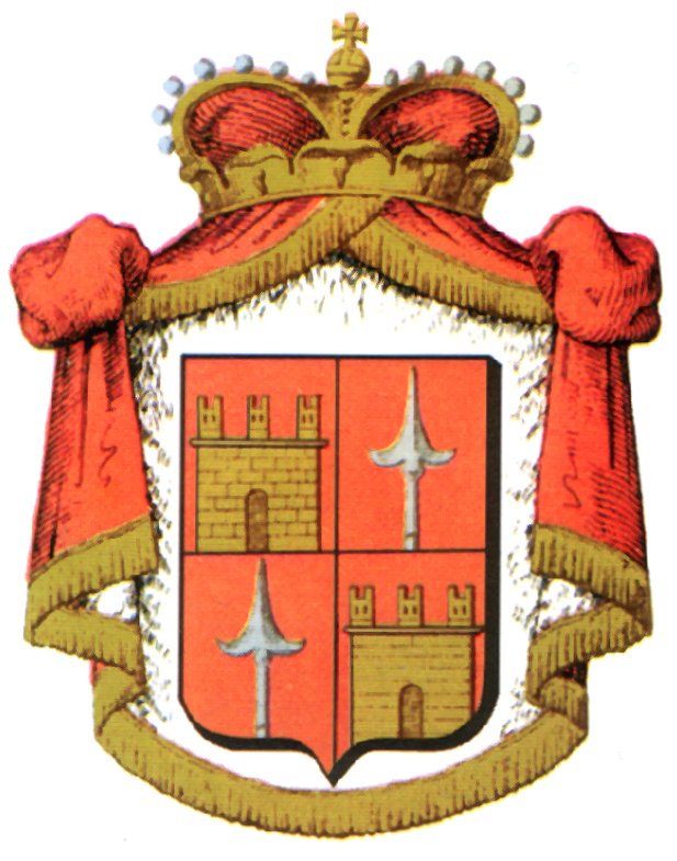 Arma: inquartato; nel 1° e 4° di oro con un’alabarda d’argento, manicata di nero; nel 3° e 4° di rosso con un castello d’oro. Corona e mantello di principe.
